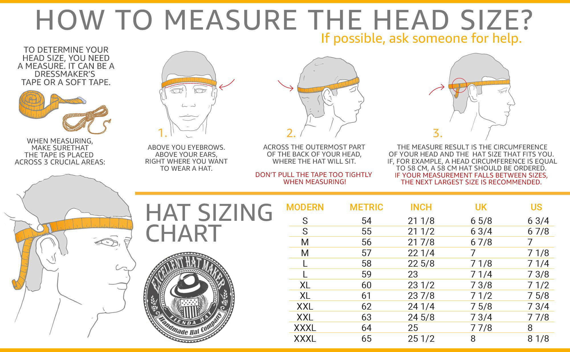 Use a tape measure (or a length of string that you will have to hold up to a tape measure) to determine the length. Place the string or tape around your head about 1/8″ above your ear, across the mid-forehead, completely circling your head. Hold the tape firmly, but not too tightly. Basically you need to measure your head exactly where the hat will sit. If your measurement falls between sizes, choose the next largest size.