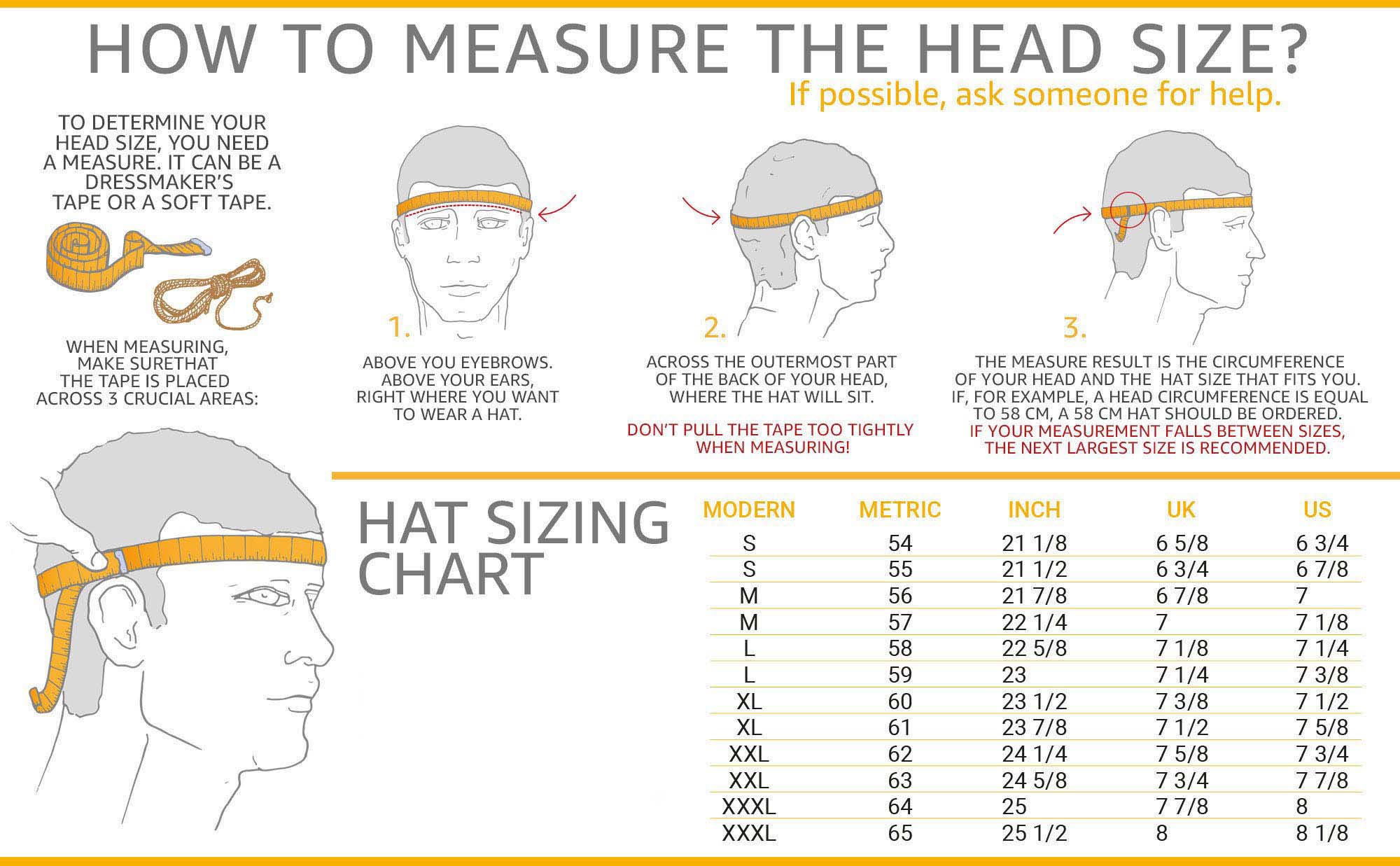Use a tape measure (or a length of string that you will have to hold up to a tape measure) to determine the length. Place the string or tape around your head about 1/8″ above your ear, across the mid-forehead, completely circling your head. Hold the tape firmly, but not too tightly. Basically you need to measure your head exactly where the hat will sit. If your measurement falls between sizes, choose the next largest size.