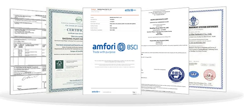 At present, Tiendahat hats has passed BSCI, SGS, ITS, ISO, RWS etc., to ensure that its products and services meet the market standards.